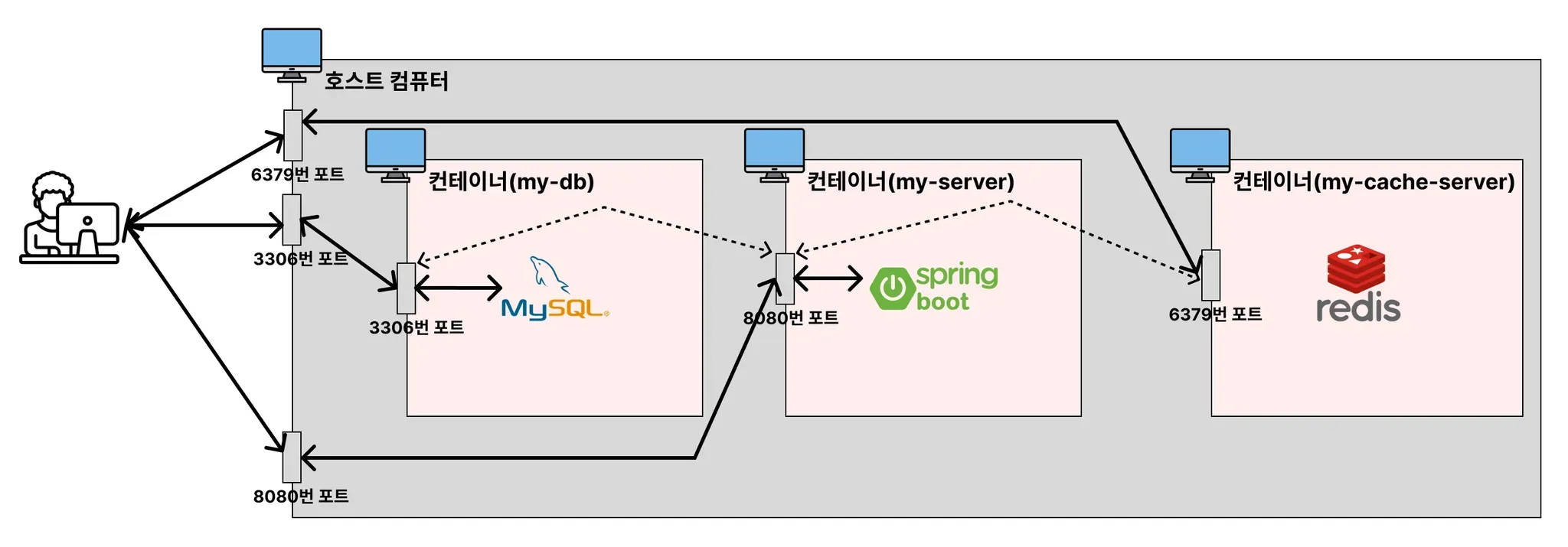 실제 웹 애플리케이션을 개발할 때를 생각해보겠습니다. Spring Boot로 개발한 백엔드 서버가 있고, MySQL 데이터베이스가 필요하며, 성능 향상을 위해 Redis 캐시 서버도 함께 사용한다고 가정해보겠습니다.